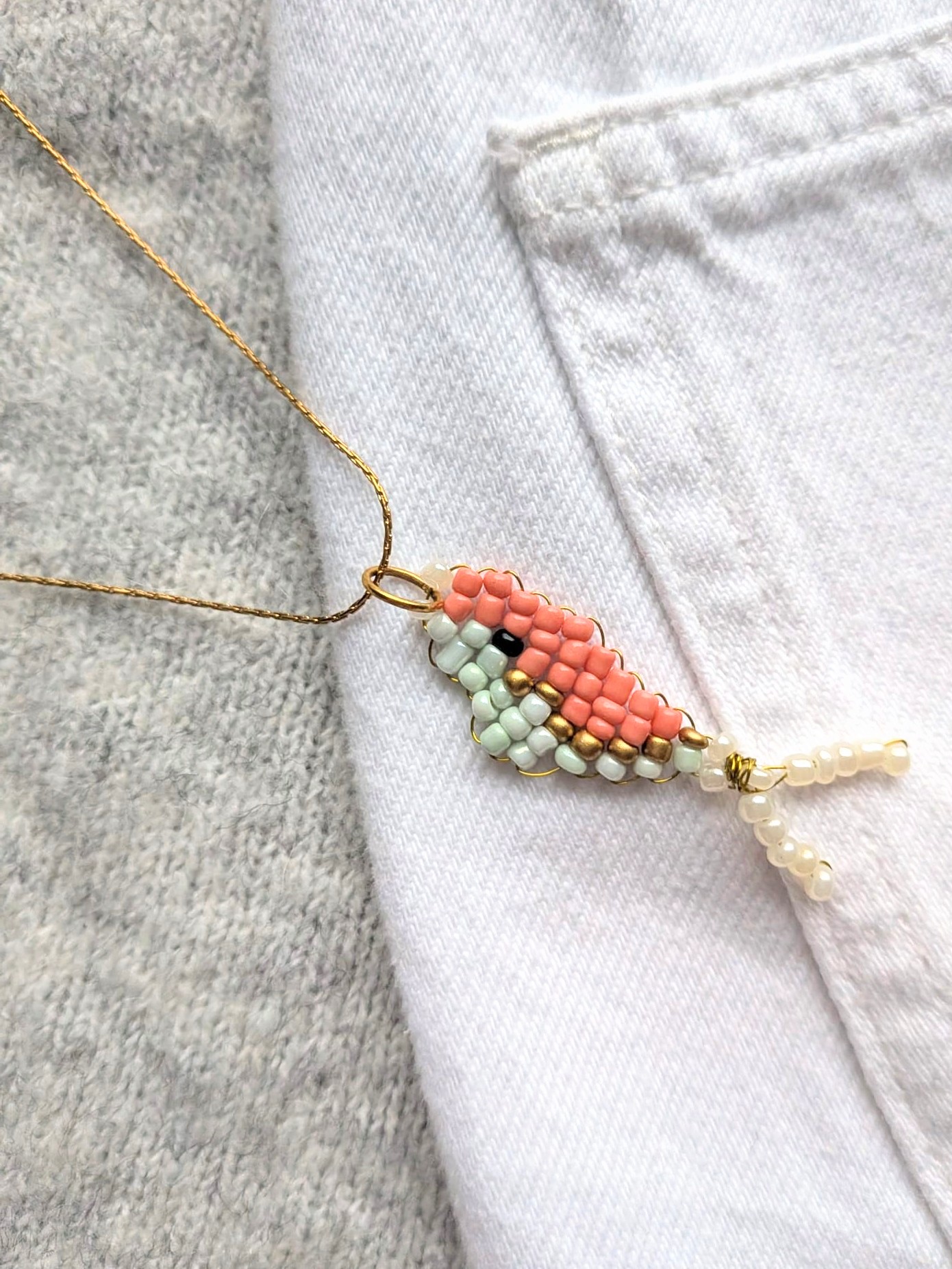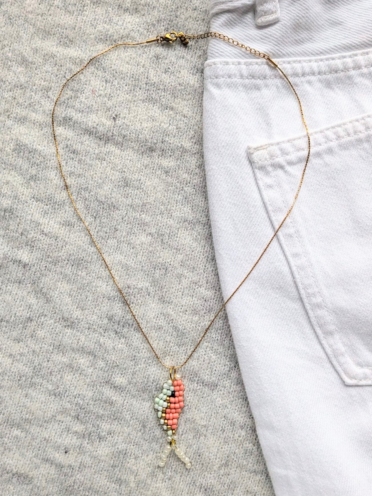 De ketting is van roestvrijstaal en de bedel is handgemaakt. De bedel is 15mm breed en 53 mm lang. De ketting is 40+5cm lang.